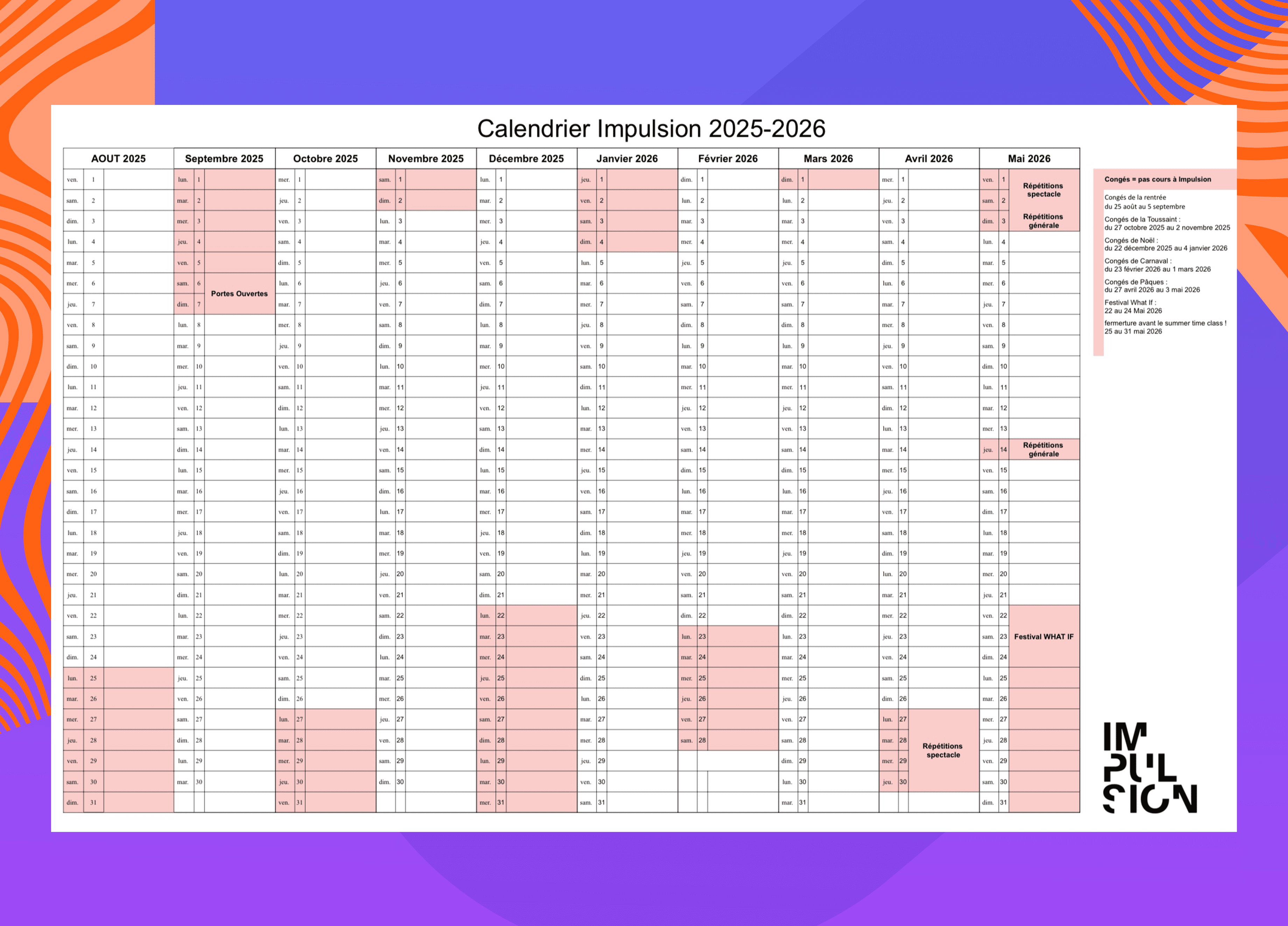 Les cours se déroulent durant toute l'année. Vérifiez tout de même sur notre agenda.
